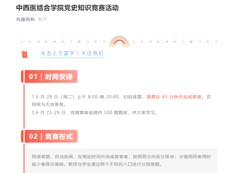 在中国共产党成立100周年之际,为扎实推进学习党史活动,进一步加深广大党员对党的历史、理论和政策的认识,6月29日,公司党委组织全院师生党员参加党史知识竞赛,共有300多名师生党员参加了此次活动,活动依托“先锋杏林”党建公众号开展。