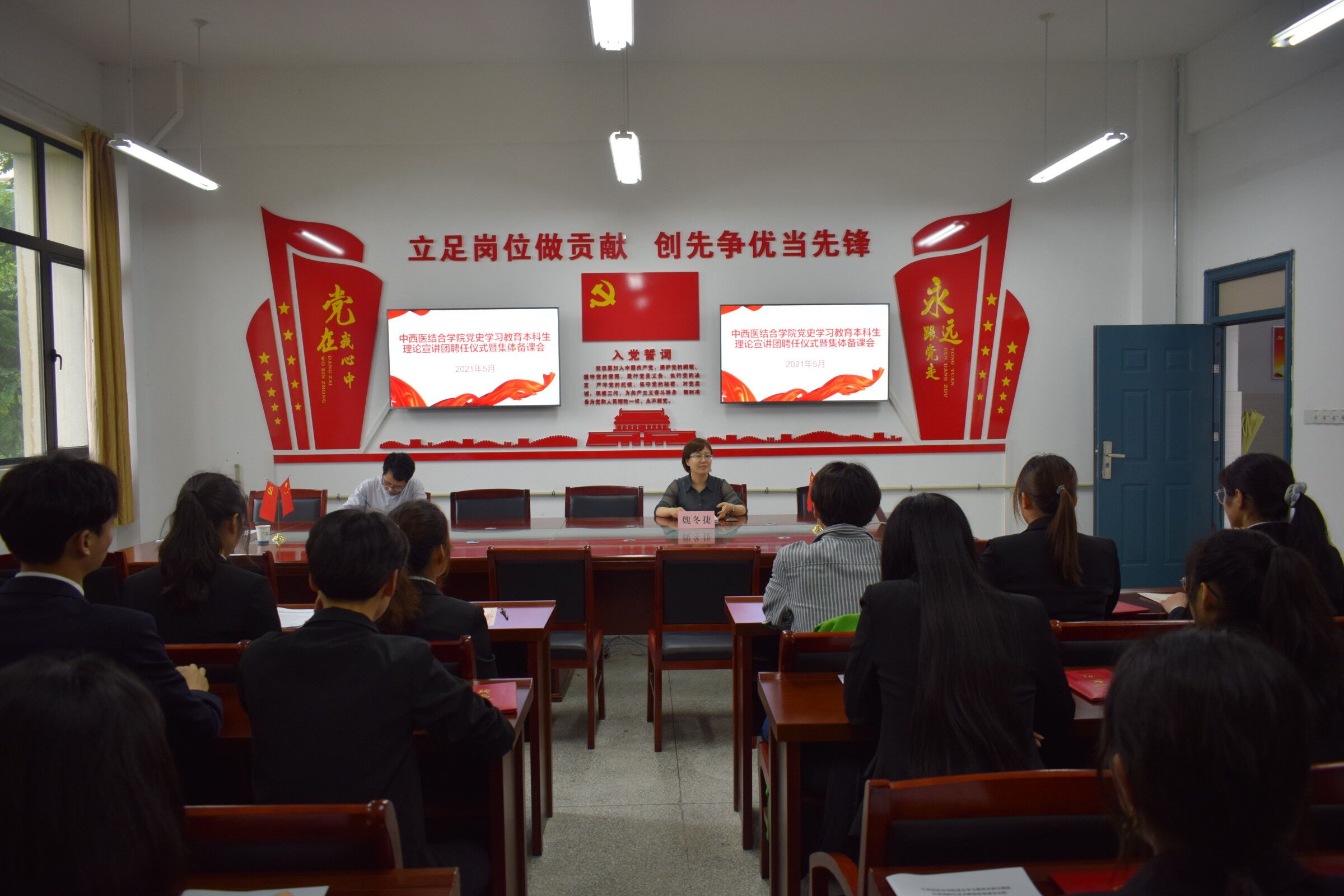 聘任仪式后,宣讲团进行了第一次集体备课。刘海霖、吴欣仪、李红悦、李思源、樊馨悦五位同学进行了示范宣讲,指导老师魏冬捷教授分享了自己的宣讲经历、传授了宣讲技巧,要求同学们精准把握宣讲对象、熟悉宣讲内容和宣讲主线,做到政治性与学术性相结合,创新宣讲形式,切实提高宣讲的实效。