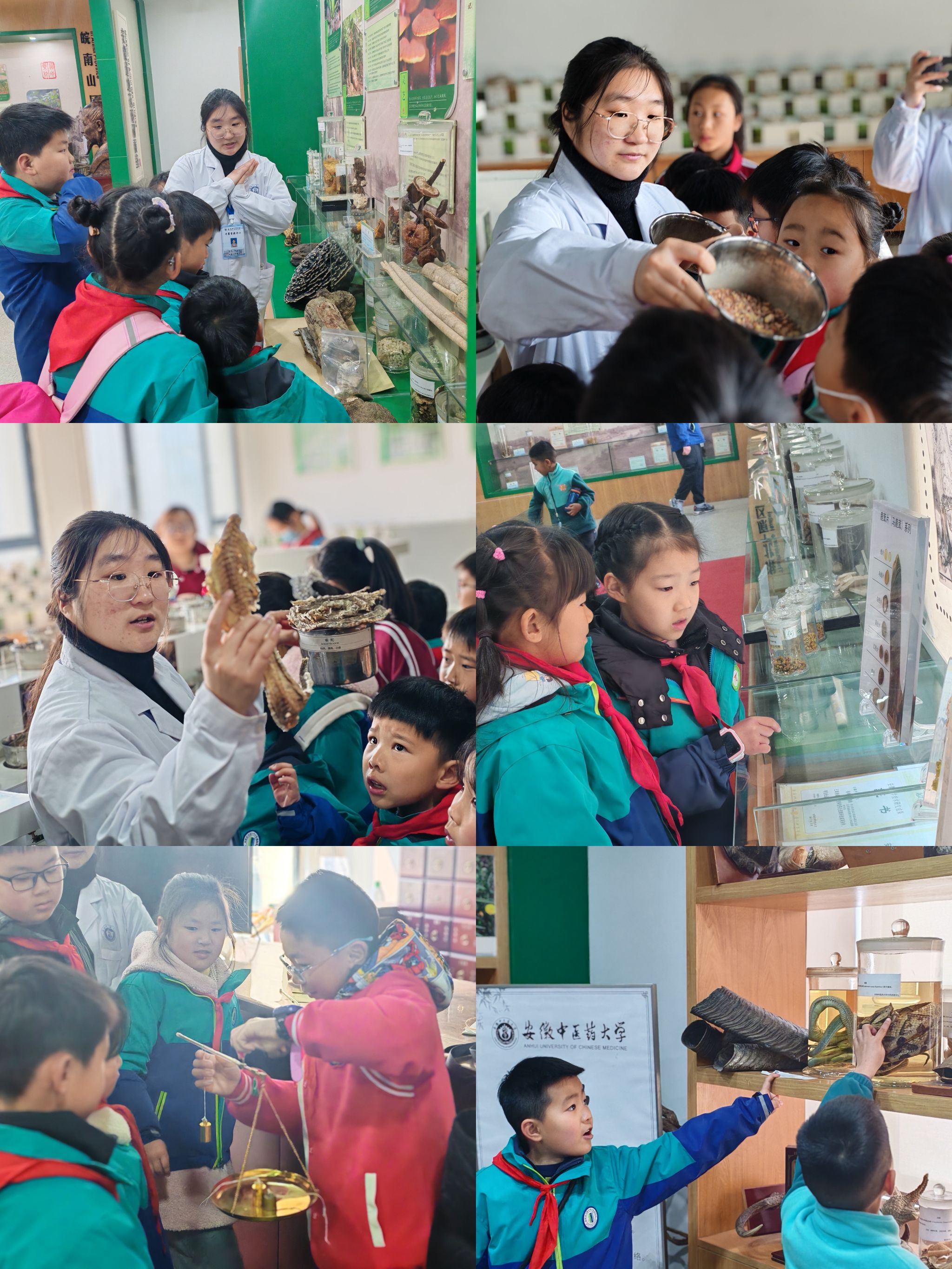 在国家中药资源中心安徽分中心,小朋友们依次参观了中药材性状辨识馆、安徽道地药材研展馆、本草研展馆、中药材研展馆、腊叶标本研藏室和中药调剂研展室等六个展室。在中药材性状辨识馆,志愿者通过“观形辨色”教学法,引导孩子们观察茯苓、丹参等中药材的形态特征,结合“闻香识药”环节让小朋友们辨别辛夷、艾草等植物的独特气味。在中药材研展馆,小朋友们化身“小药工”,在志愿者指导下使用戥秤称量药材,体验“一钱一两皆精准”的严谨态度。在讲解途中,孩子们积极踊跃地提问,“一年生灵芝这么大吗?”“五步蛇在罐子里怎么不坏掉?”等问题,志愿者一一为小朋友们答疑解惑,现场氛围十分热烈且充满求知的活力。