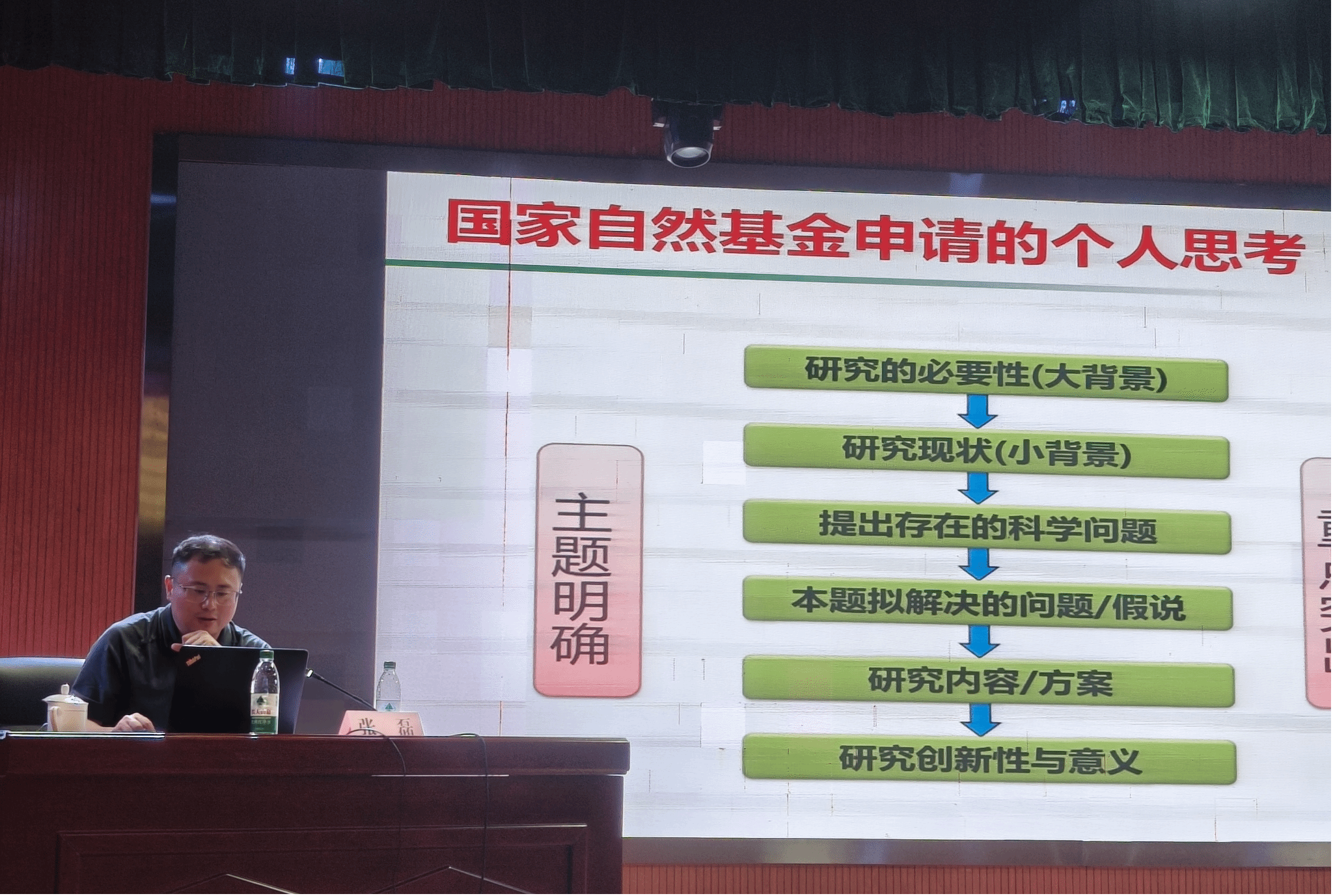 报告会第二阶段,张磊教授从国家自然科学基金项目撰写前的准备工作、撰写申报书的基本流程、科研项目申请成功的几个要素等方面给予具体指导,并以课题组教师申报青年基金项目、面上基金项目、联合基金项目为例,分享了项目申报的经验,为青年教师科研成长提供了可供借鉴的范式。
