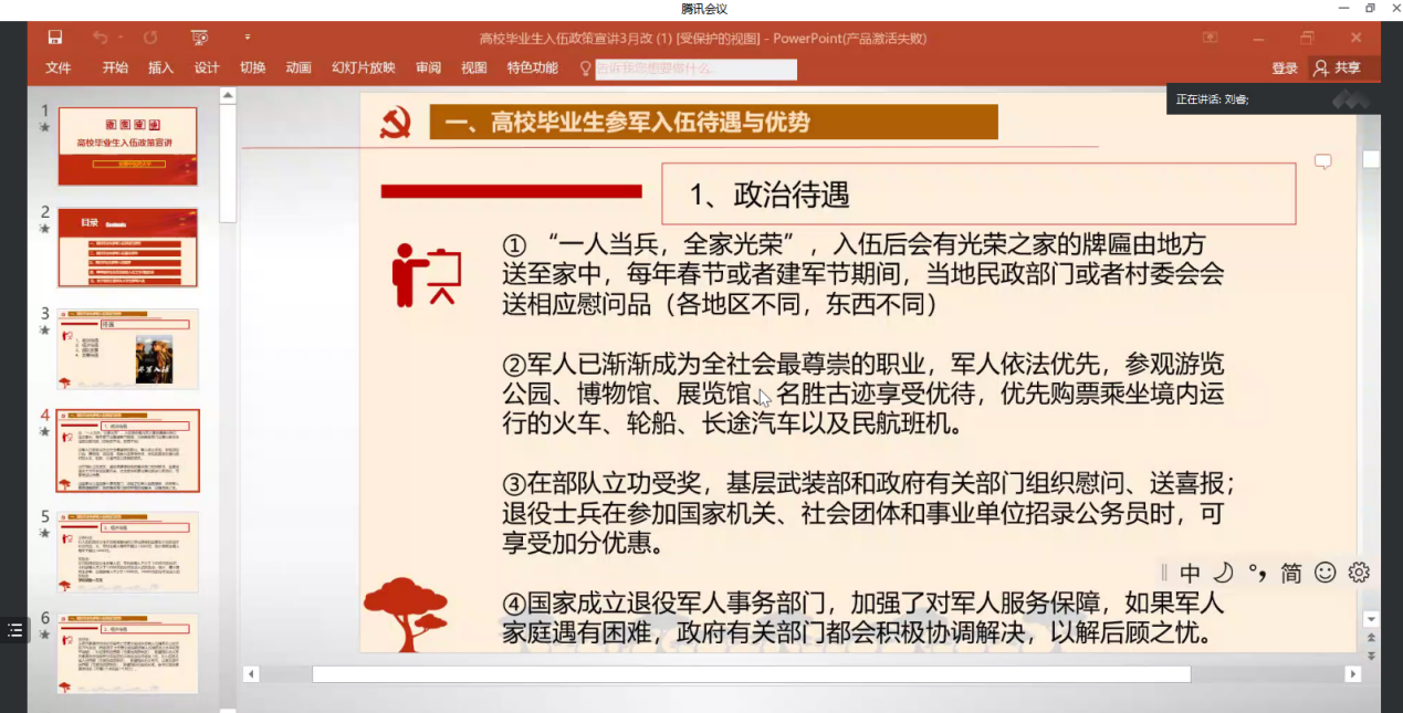 詹钟华从老员工为什么要参军、入伍途径、征兵政策的变化以及毕业生如何参军等方面进行了解读,鼓励同学们积极响应国家号召,把握机遇,在部队发挥专业特长,施展远大抱负,让青春之花在火热的军营绽放。刘睿从高校毕业生参军入伍待遇与优势、基本条件、程序、日程安排等方面作了老员工应征入伍的政策宣讲,让同学们对高校毕业生参军入伍相关政策有了更加清晰的认识和了解。