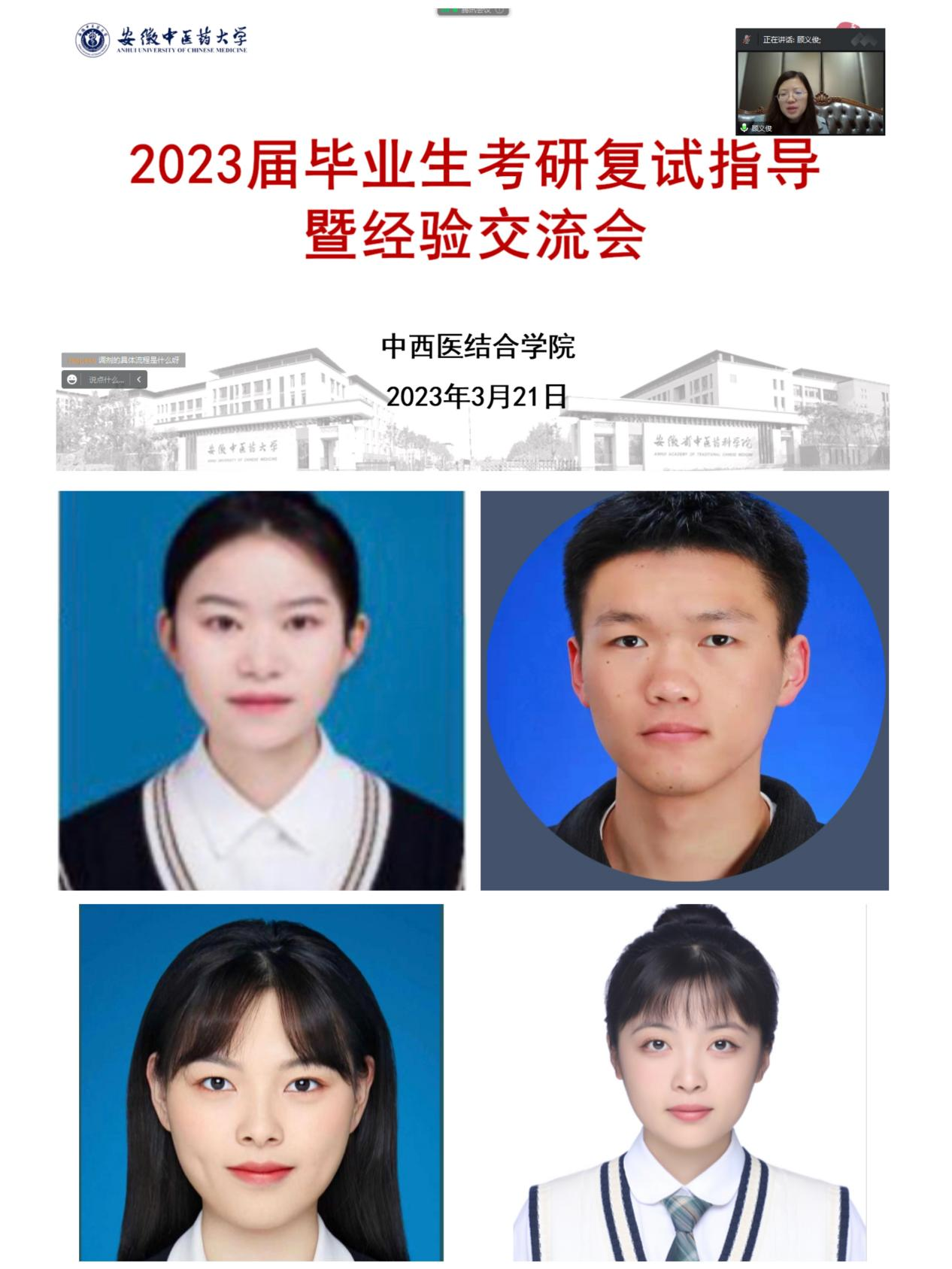 随后,湖南中医药大学在读研究生金红从复试前、中、后三个阶段可能遇到的问题等方面分享了自己复试、调剂的经历与经验,告知同学们需理性看待、全力准备,同时鼓励大家充分展示自己,充满自信地去面对复试考官。马润峰、卫舒蕾、汪隽婉三位同学根据目前就读院校分别介绍了上海中医药大学、暨南大学、TapTap点点官方网站的复试流程、2022年录取情况以及如何联系导师等,建议同学们及时关注研招网调剂信息和调剂院校动态,学会整合利用资源,把握“上岸”机会。