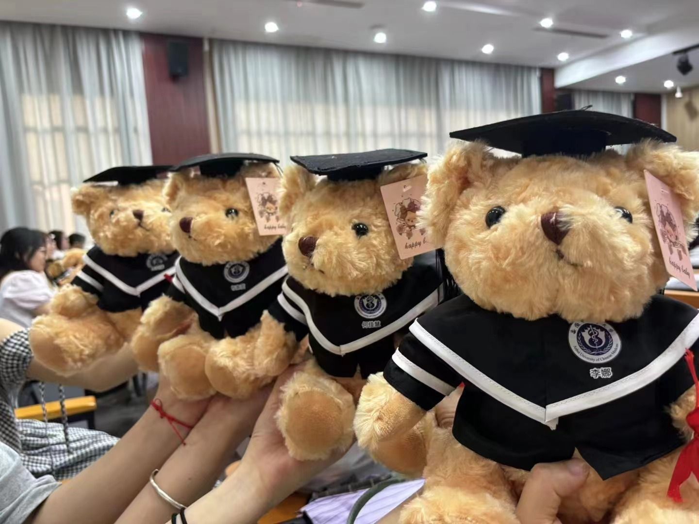 公司为毕业班同学定制专属毕业小熊,毕业小熊头戴学位帽,手拿学位证书,身着有校徽和姓名的学位服。萌态可掬的学位熊不仅是对毕业生们学业成就的认可,也饱含公司对毕业生们的祝福,希望毕业生们始终怀揣着一颗求知的“赤子之心”,继续披荆斩棘、勇往直前!