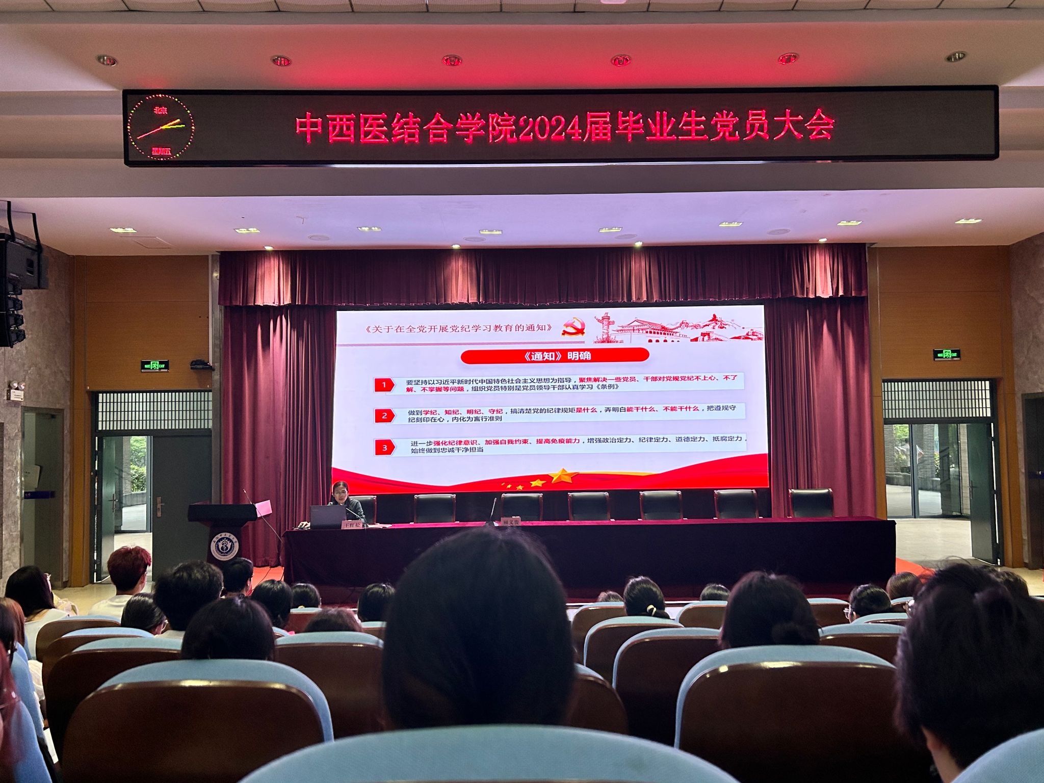 王红松首先为毕业生党员上了一堂党纪学习教育专题党课,从《中国共产党纪律处分条例》(以下简称《条例》)历次修订概况、修订《条例》的重要意义、《条例》修订的主要内容及认真抓好《条例》的贯彻执行等方面对《条例》进行了深入细致地解读。她对毕业生党员提出殷切希望:一要坚定理想信念,提高党性修养;二要坚守入党初心,牢记入党誓词;三要涵养清廉本色,严守纪律规矩;四要磨砺意志品质,提升综合素质。最后,王红松带领全体毕业生重温入党誓词。