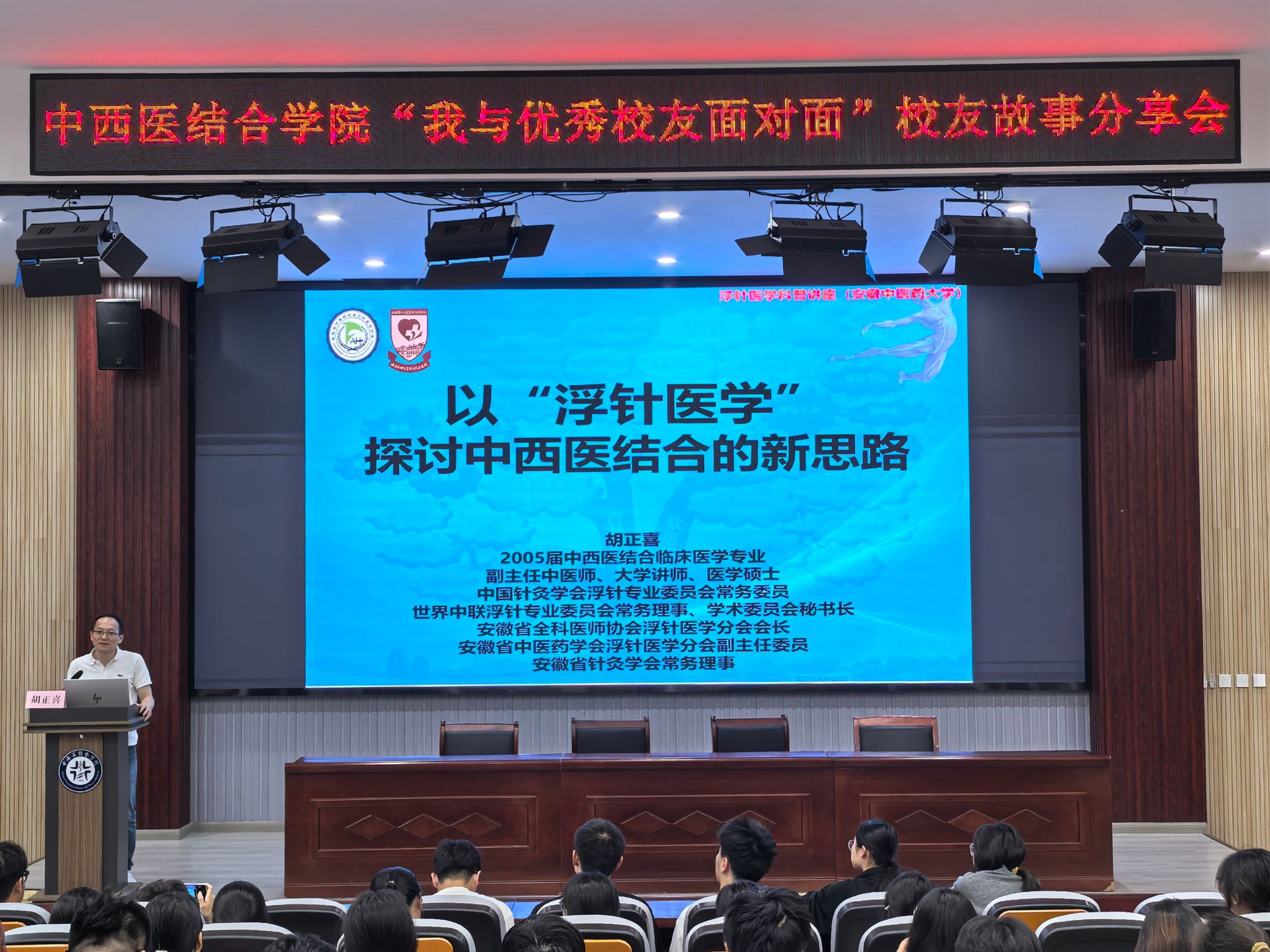 2005届员工胡正喜首先作了题为“以‘浮针医学’探讨中西医结合的新思路”的主题分享,通过真实病例视频展示了浮针疗法的显著疗效,让同学们对浮针疗法有了初步的了解。并详细介绍了浮针疗法的发展历程、作用原理及操作要点,他特别提到博士生导师符仲华教授发明浮针的艰辛历程,强调浮针疗法的科学性和创新性,激发了同学们对中西医结合技术的浓厚兴趣。