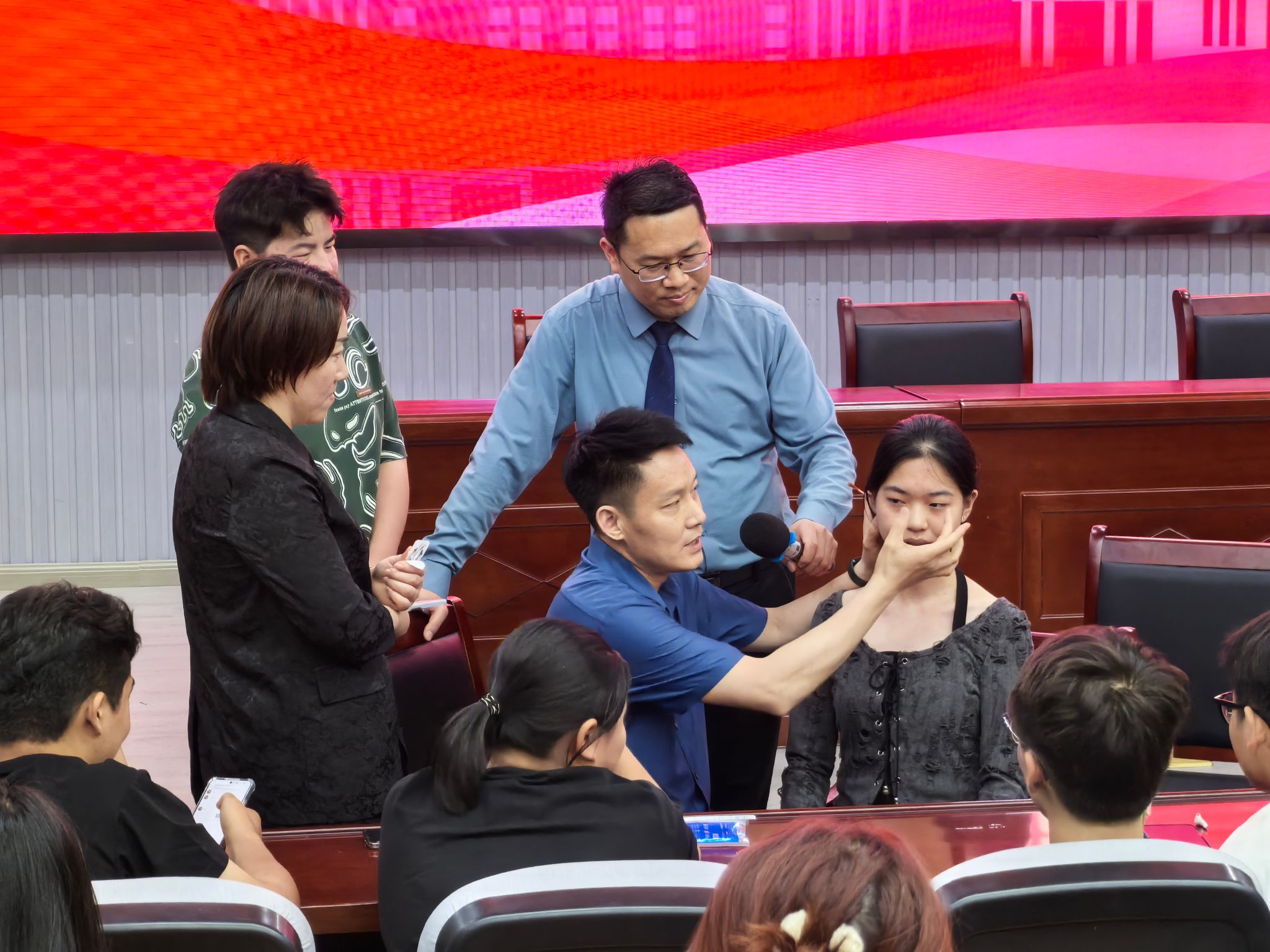 随后,在现场实操演示环节,2004届员工刘照勇和2009届员工高顶平先后演示了颈椎病、腰痛、肩痛等常见病症的浮针操作示范,系统讲解了适应症判断、治疗思路构建、操作流程规范等临床要点,并邀请同学互动体验。浮针立竿见影的效果让在场师生惊叹不已,大家纷纷提问交流,现场气氛达到高潮。
