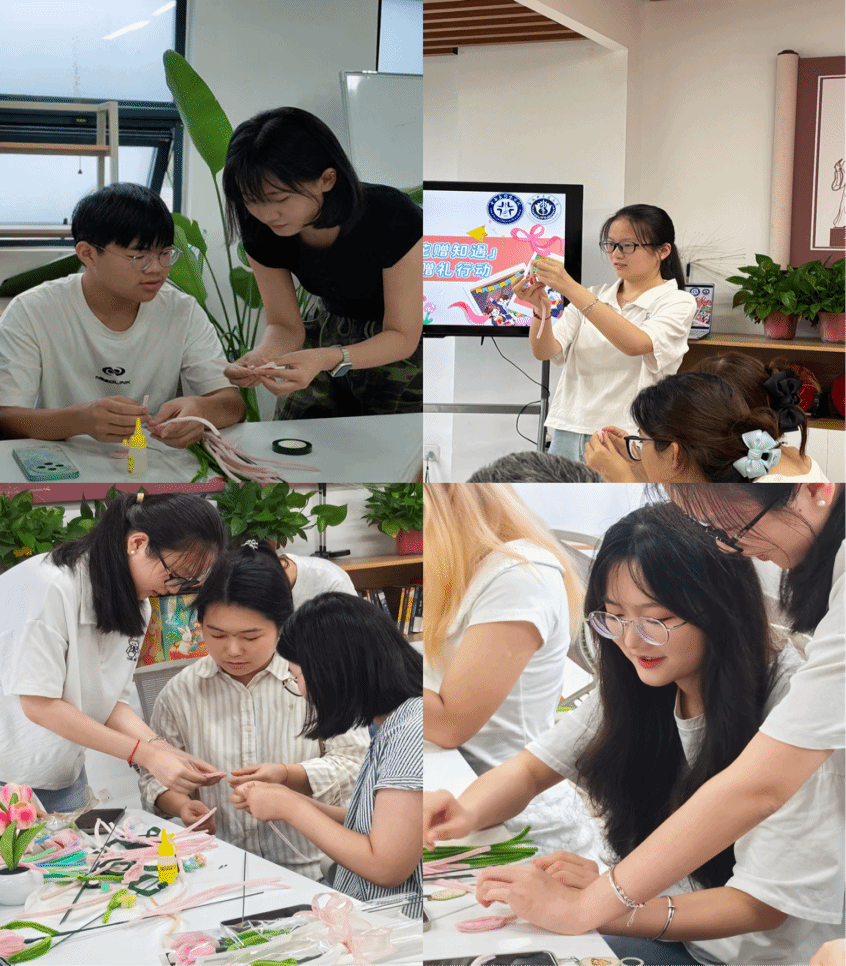 在手作区,彩色扭扭棒、丝带、彩笔等材料整齐陈列,志愿者全程指导,心灵手巧的同学还主动担任“小老师”,带领大家创作感恩花束。无论是初学者还是有经验的参与者,都在热烈的氛围中专注投入,一根根普通的扭扭棒在大家的巧手下变成一朵朵色彩明快、姿态灵动的花朵。
