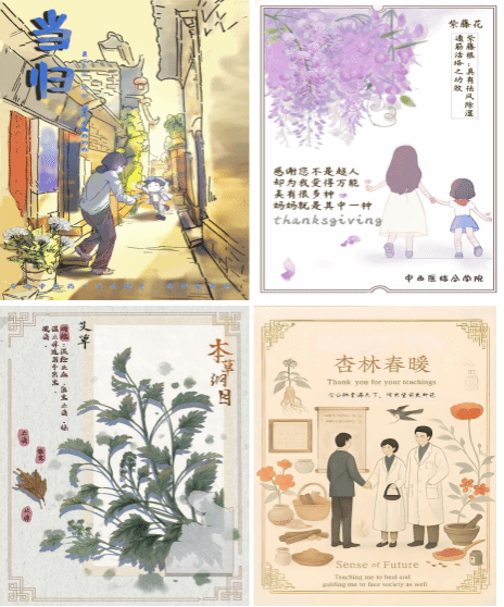 8月8日至8月27日,“笺载浓情·片语传恩”感恩明信片设计活动成功举办。活动面向全体员工征集原创感恩明信片作品,形式包括手绘、拼贴、数码合成等多种创作方式,旨在让同学们通过艺术创作表达内心的感激之情。在作品创作过程中,员工们将中医药元素巧妙融入明信片设计,如当归、艾草等药材图案,既体现了“本草传情”的特色,又增添了文化内涵。同学们有的通过AI绘画描绘师长的教诲瞬间,有的通过拼贴表现同窗互助的温馨场景,还有的以数字图像结合文字创意,将感恩情感呈现得生动而真切。部分作品还通过“未来邮局”方式寄存,定期寄送给收信人,使感恩不仅停留在当下,更延续为长久的纪念。
