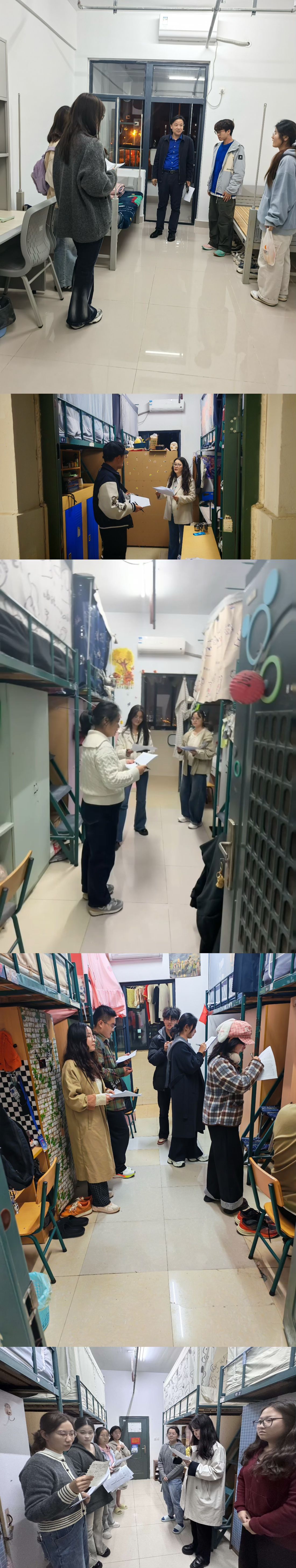 检查过程中,各小组深入每间员工宿舍,重点围绕以下几个方面展开:一是安全隐患排查。严格检查宿舍内是否存在违规使用大功率电器、私拉乱接电线、存放易燃易爆物品等现象,确保用电安全、消防安全无死角。二是卫生环境督导。仔细查看宿舍整体卫生状况,包括地面、桌面、阳台整洁度,物品摆放是否整齐,垃圾是否及时清理,督促员工保持干净宜居的室内环境。三是设施状况了解。关心询问同学们宿舍基础设施,如桌椅、床铺和空调等使用情况,记录需要报修的问题,以便及时向相关部门反馈协调解决。四是文明风尚倡导。与同学们亲切交流,了解他们的学习生活近况,提醒大家注意日常通风,预防季节性疾病,并倡导室友间互相关心、互相帮助,共同维护良好的宿舍氛围,杜绝沉迷游戏等不良习惯。