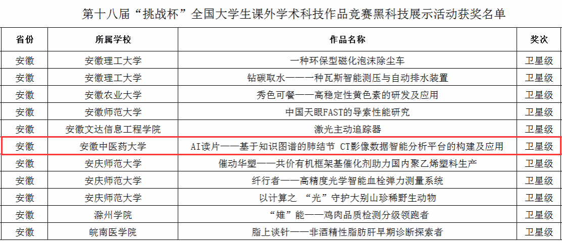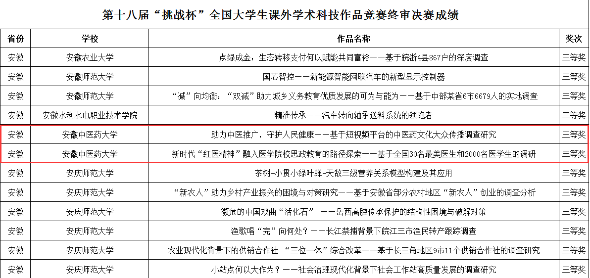 公司参赛作品TapTap点点作品《新时代“红医精神”融入医员工思想政治教育的路径探析 ——基于全国 30 名最美医生的调查研究》、人文与国际教育交流公司作品《基于短视频平台的中医药文化大众传播调查研究》分别荣获主赛道国家级三等奖,TapTap点点作品《AI读片——基于知识图谱的肺结节 CT 影像数据智能分析平台的构建及应用》荣获黑科技赛道国家级卫星级奖项(三等奖)。另有多项作品在安徽省“挑战杯”系列竞赛中获得各类奖项59项。