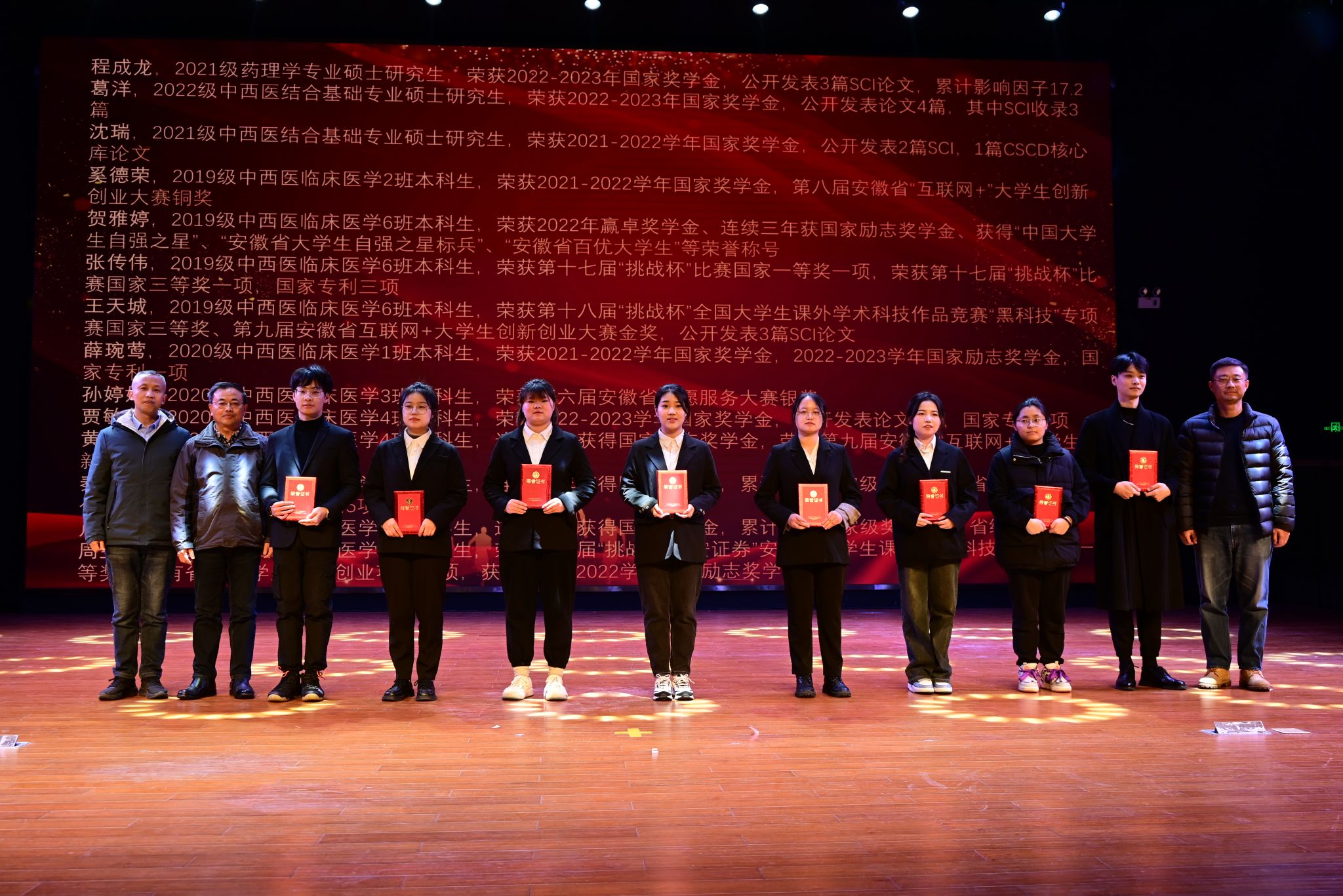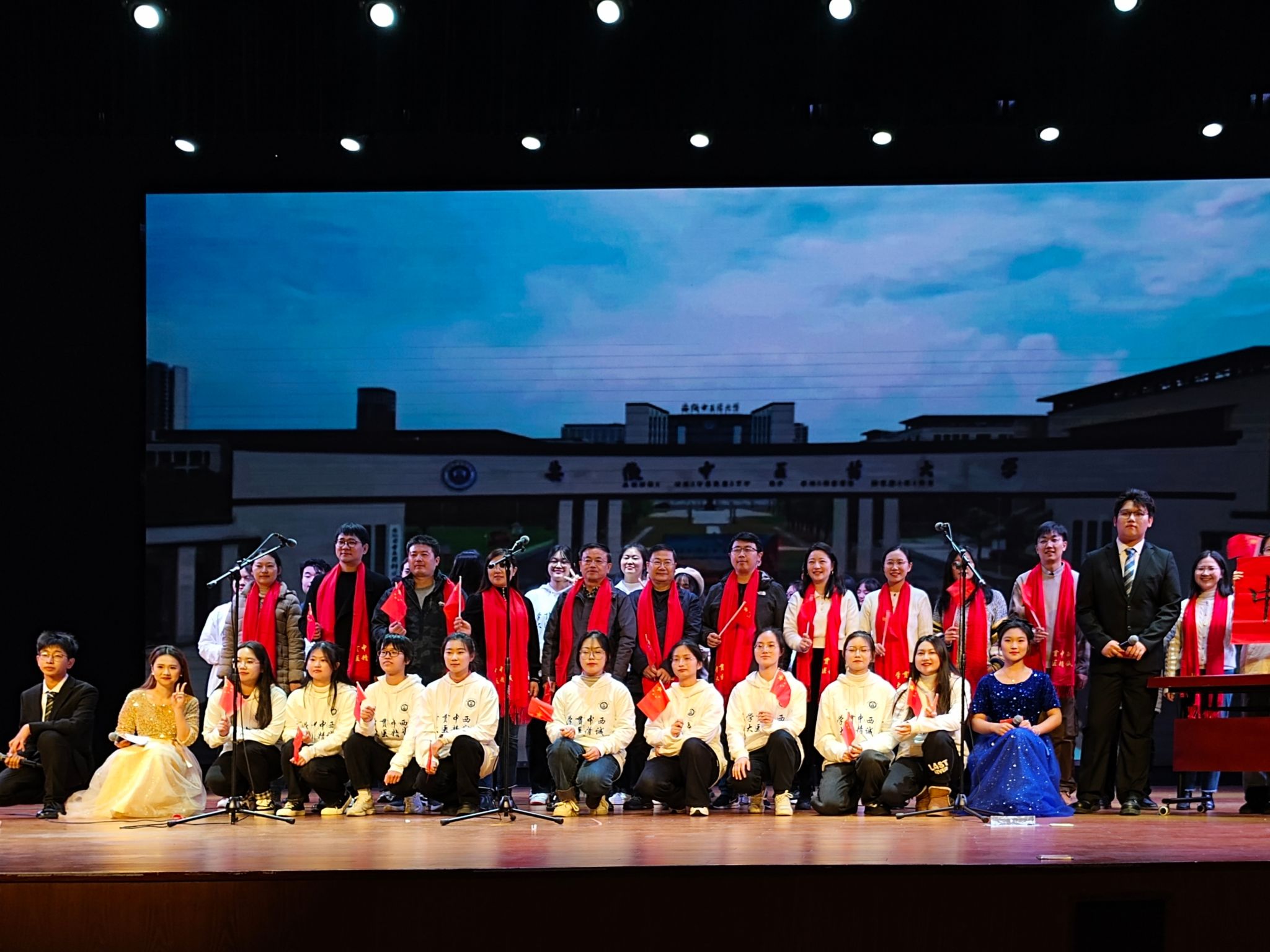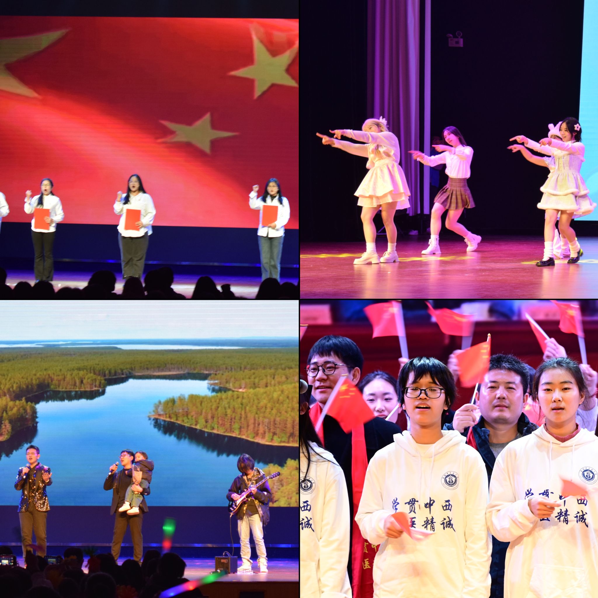 晚会分三个篇章,通过舞蹈、歌曲、朗诵、表彰等丰富的形式,在老员工舞蹈协会带来的开场舞《bubble》中拉开序幕,轻快的脚步和活泼的舞姿点燃了全场的热情。辅导员成伟业和员工们带来歌曲《海阔天空》,嘹亮动听的歌声击破寒夜,传达出对中西医学子的希冀和鼓励,将全场观众的欢呼声推向了更大的浪潮,公司员工党员带来的朗诵《致青春》,娓娓道来,讲述了青春献给党的故事,坚定了青年学子们对党的信仰、对祖国的忠诚。在师生同台的合唱节目《我相信》中,晚会徐徐落下帷幕,生动展现了中西医学子砥砺前行,不忘初心的使命担当。