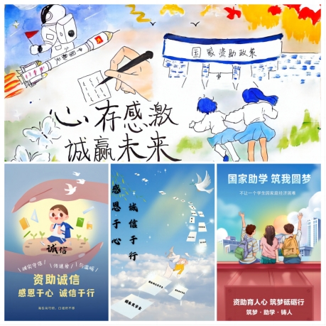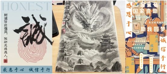 参赛同学紧紧围绕资助诚信、诚信教育、感恩教育及相关主题,以宣扬诚实守信、诚信资助的精神,引导同学们树立正确的世界观、人生观和价值观为设计主旨进行海报设计或绘画。本次活动得到了多个专业、年级的同学的踊跃参与,参赛作品丰富多样,内容涵盖了感恩、诚信、勤奋、奉献等多个方面。不仅在艺术表现形式上独具匠心,更是通过图文并茂、寓意深刻的方式,传递出了深厚的情感和社会责任感。经过员工投稿、评委审核与打分,评选出12份获奖作品进行表彰。
