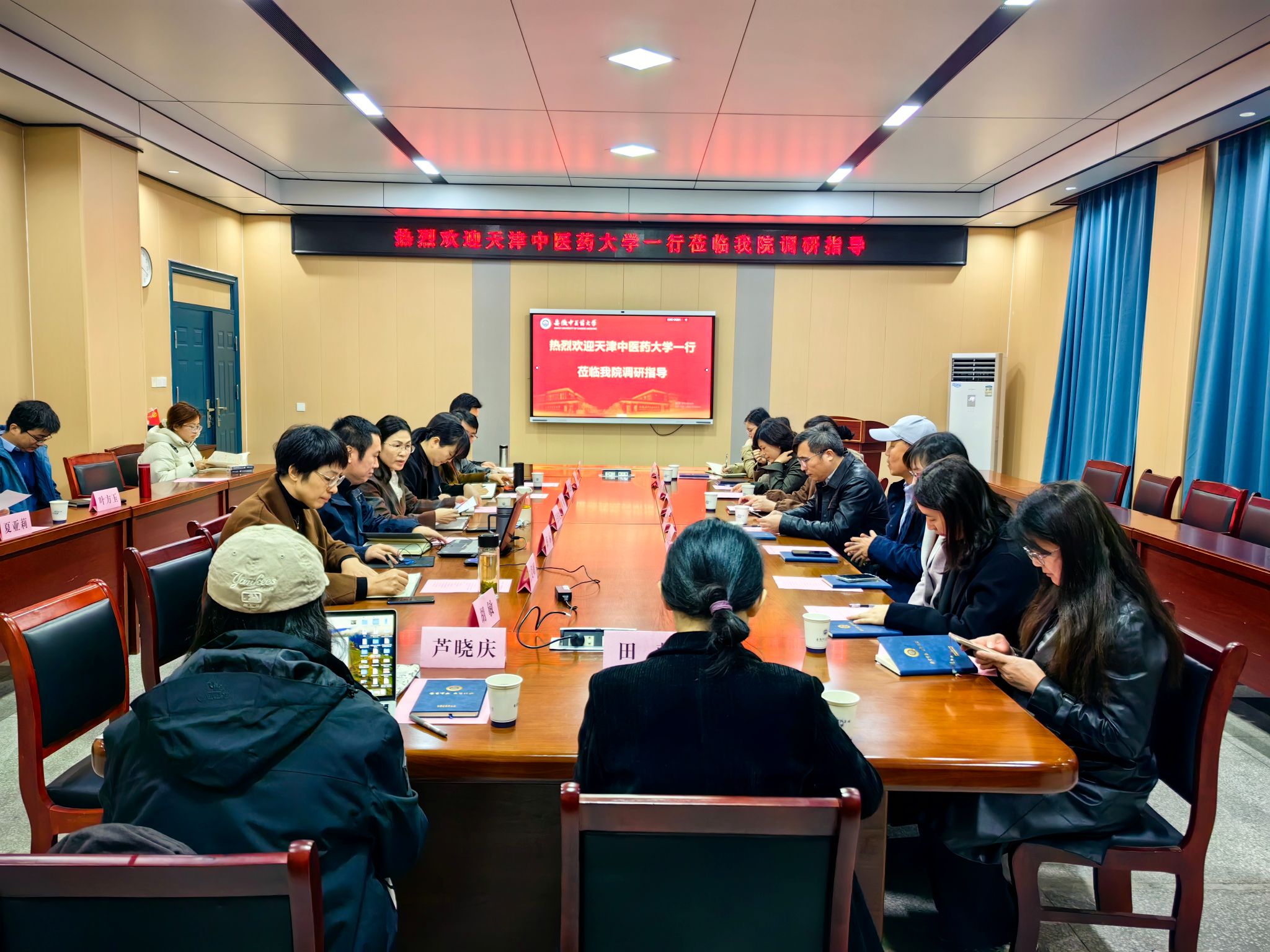 11月20日,天津中医药大学公司党委书记王智勇、教务处副处长祁建松一行11人莅临公司考察调研中西医临床医学专业认证工作。公司教务处副处长周晴、公司党委书记王红松、经理蔡标、副书记顾义俊、副经理江爱娟、副经理王靓、公司各办公室主任参加调研座谈会。会议由王红松主持。