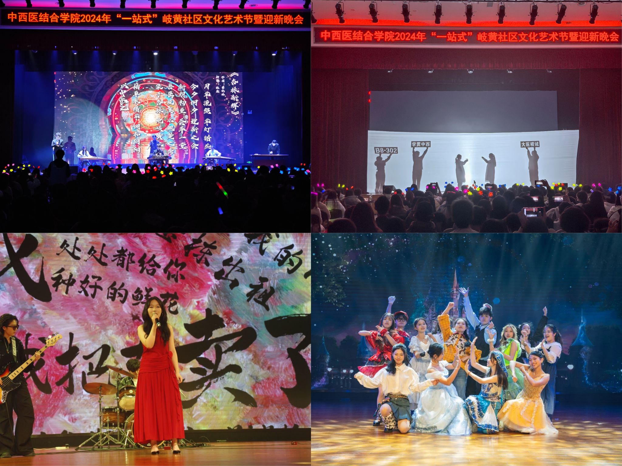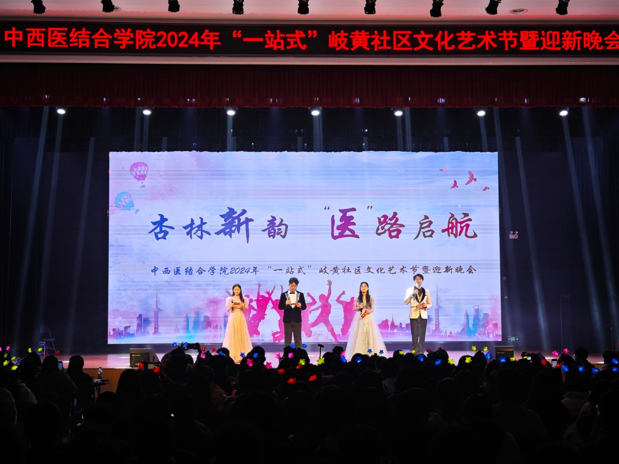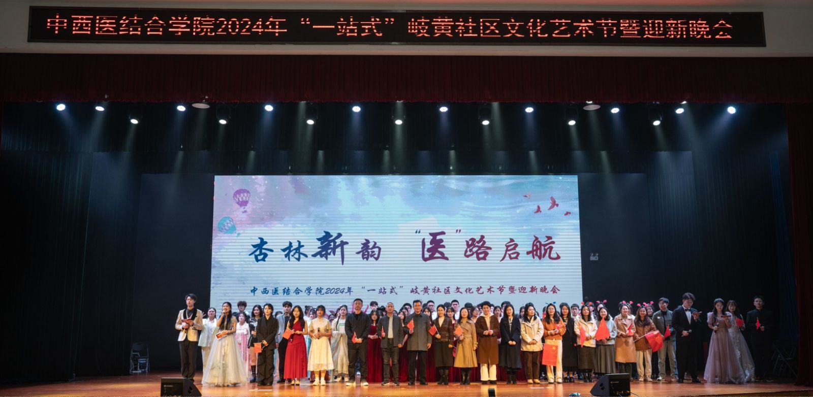 晚会开场文言文《杏林新辉》演出人员一登场便点燃了现场氛围,这场集扬琴、古筝、朗诵、书法等多元艺术于一体的开场秀,成功为这场盛会奏响了震撼开篇。晚会节目各具特色,歌舞、脱口秀、小品、乐队、幕布剧等表演异彩纷呈,现场欢声笑语此起彼伏。中西医学子的梦想和奋进不仅存在于浩如烟海的医学典籍里,也绽放在人文和艺术之中。