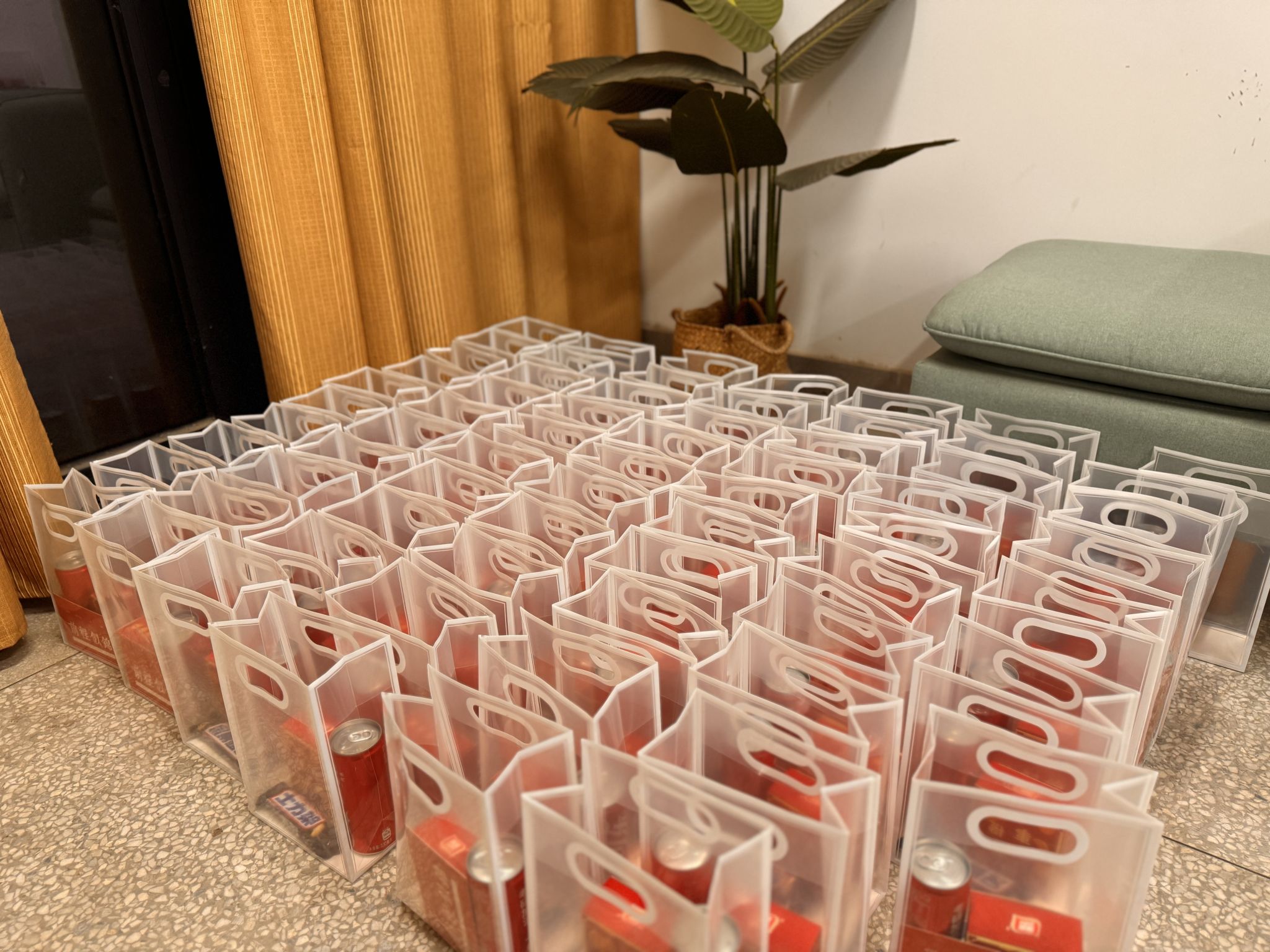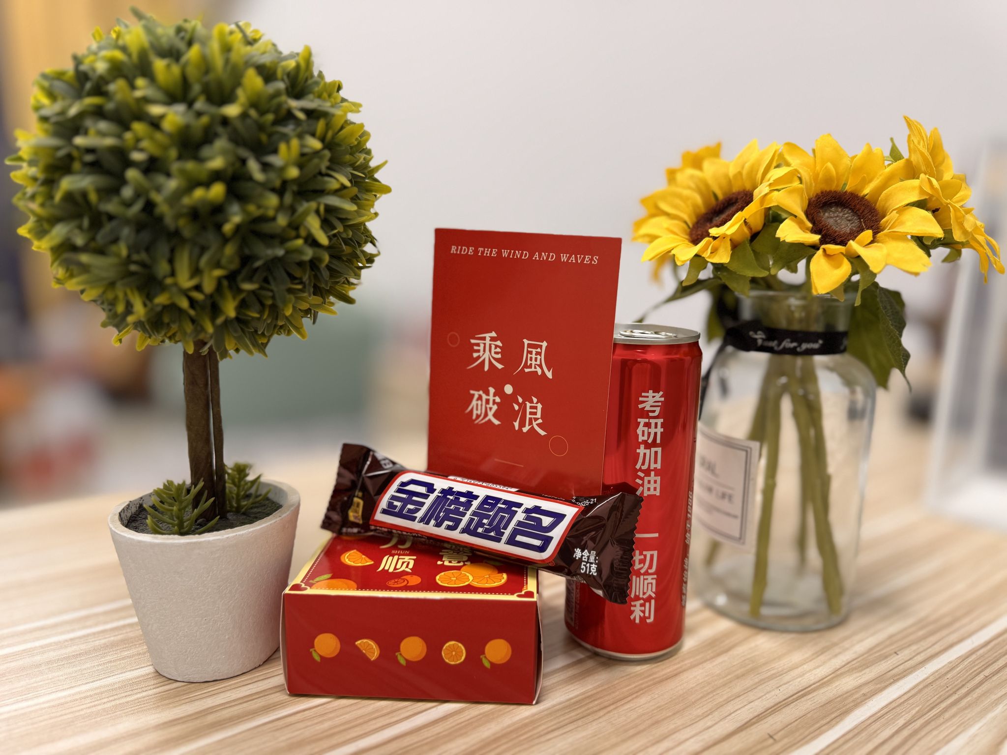 从“金榜题名”士力架、“万事顺意”糖果、“好柿花生”饼干,到祝愿“考研加油,一切顺利”的可口可乐,再到学弟学妹们撰写的“乘风破浪”“前程似锦”祝福贺卡,每个礼物都蕴含着美好的寓意,不仅传递了公司对考研学子的深深期望与殷切祝福,更为他们的考研之路增添了一份温情。