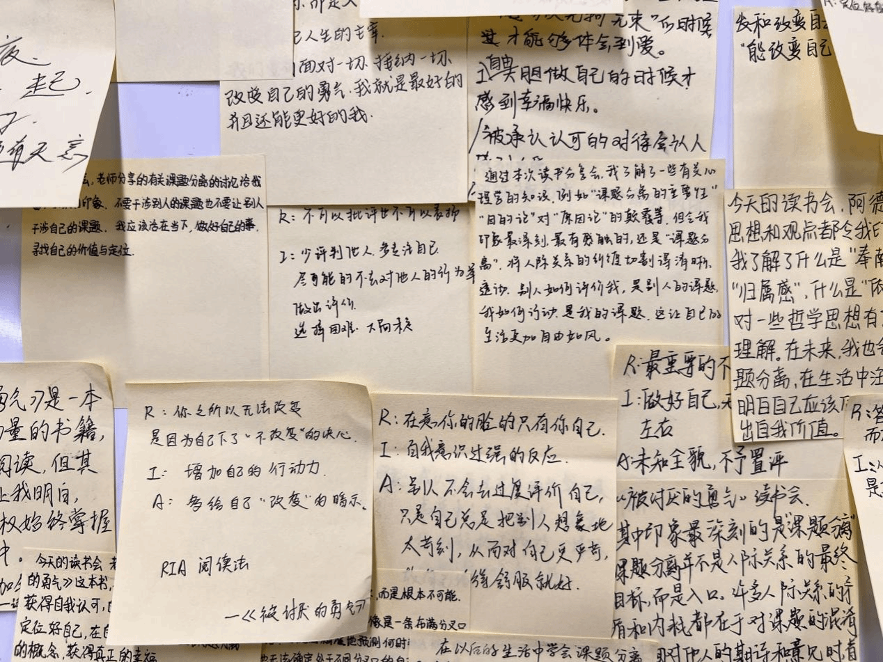 活动伊始,顾义俊邀请参与师生分享阅读初衷或感受。参与者们从学习压力、寝室关系、亲子关系、社会期待等角度切入,结合书中阿德勒心理学的“课题分离”“目的论”等观点共同讨论。结合“RIA”阅读法介绍,在“金句共读”环节中顾义俊引导师生轮流朗读书中经典段落,并从阅读原文片段,个人重述和下一步怎么应用三个方面展开热烈讨论。为深化思考,活动特别设置“勇气卡片”互动,参与者在卡片上写下参加此次读书会的收获、启发和今后运用,让参与者体验到“支持与被支持”的力量。