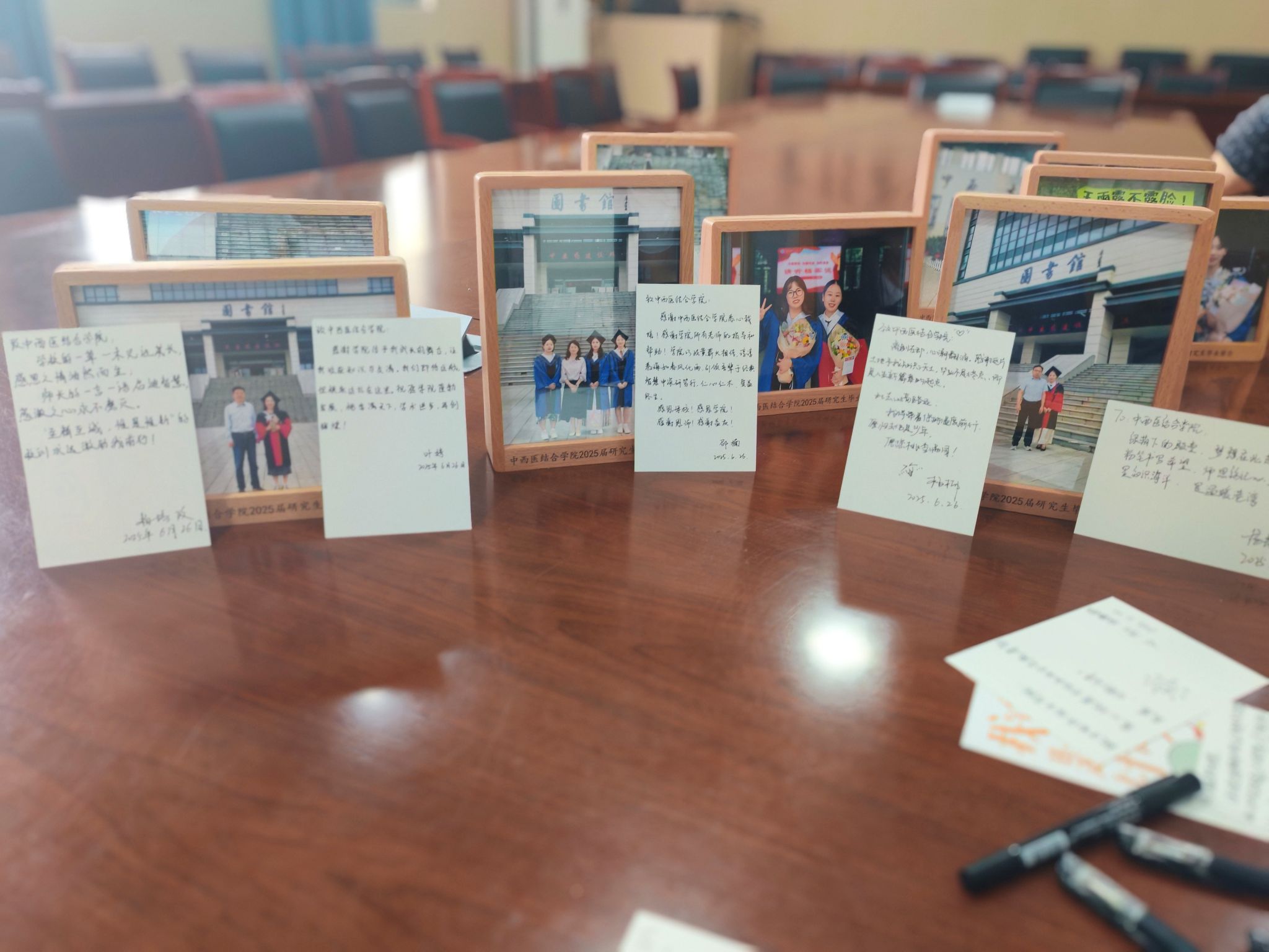 活动前期,公司通过线上线下渠道广泛征集毕业生与导师的合影素材及师生寄语,同步完成照片冲印、定制相框等筹备工作。6月26日,“明信片传情・岐黄寄梦” 活动在公司B216会议室举行,现场首先展示导师为毕业生手写的祝福明信片,字里行间满是对学子 “中西合璧、守正创新” 的专业嘱托与人生期许。随后,毕业生代表们手持明信片,将对公司的感恩之情与职业展望凝于笔端,投递至 “毕业信箱”。
